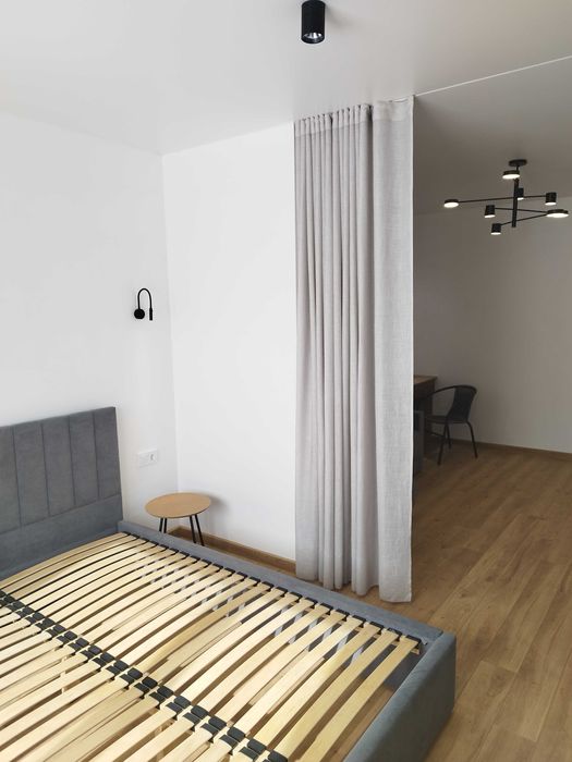Кімната зонована на дві частини, в одній ліжко з прикроватними столиками та зона макіяжного столу, у другій частині - кутовий диван, зона тв з підвісною тумбою та зручний повноцінний письмовий стіл з шухлядами. Зроблено багаторівневе освітлення у кожній зоні.