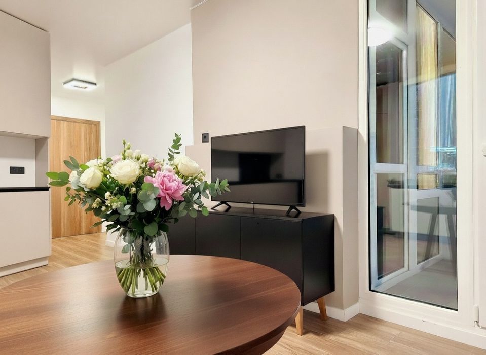 Зона обідня з диваном, столом, телевізор. Вихід на балкон.