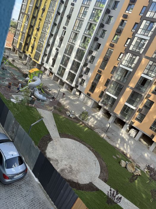 Вікна виходять у затишний двір із сучасним благоустроєм – ідеальне місце для відпочинку родиною.