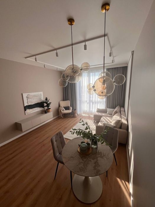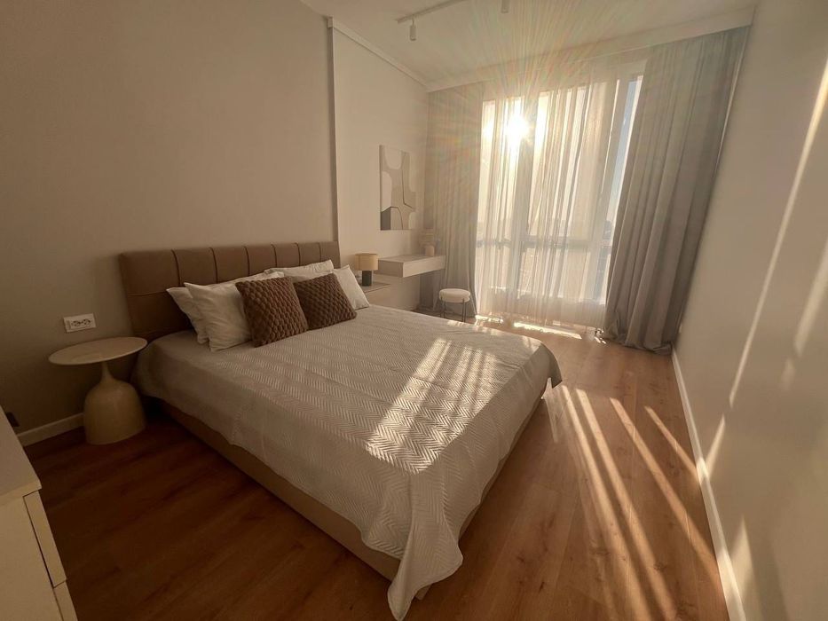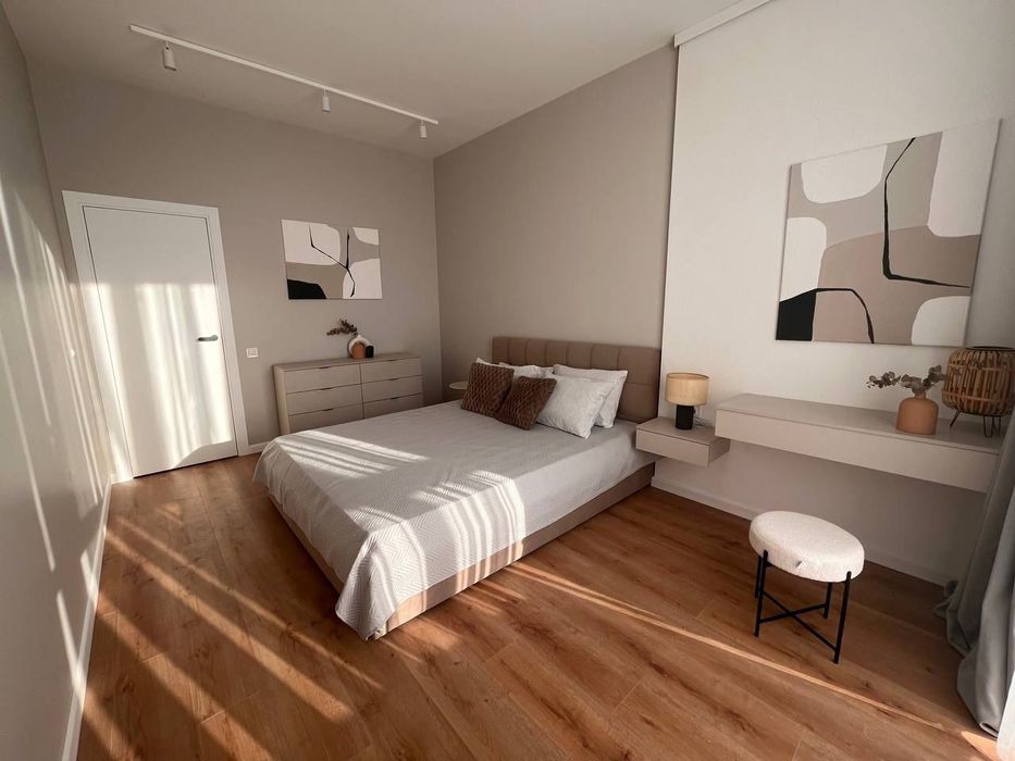 Пропонується в оренду стильна квартира: кухня-вітальня, окрема спальня, гардеробна та ванна кімнати. 21й поверх.