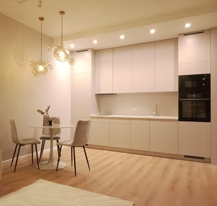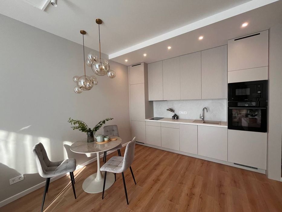 Квартира з якісним, дизайнерським ремонтом. Великі панорамні вікна, що виходять на захід. Вбудована кухня з усією необхідною технікою: холодильник, посудомийна, духова шафа, мікрохвильова піч, варильна поверхня, витяжка.