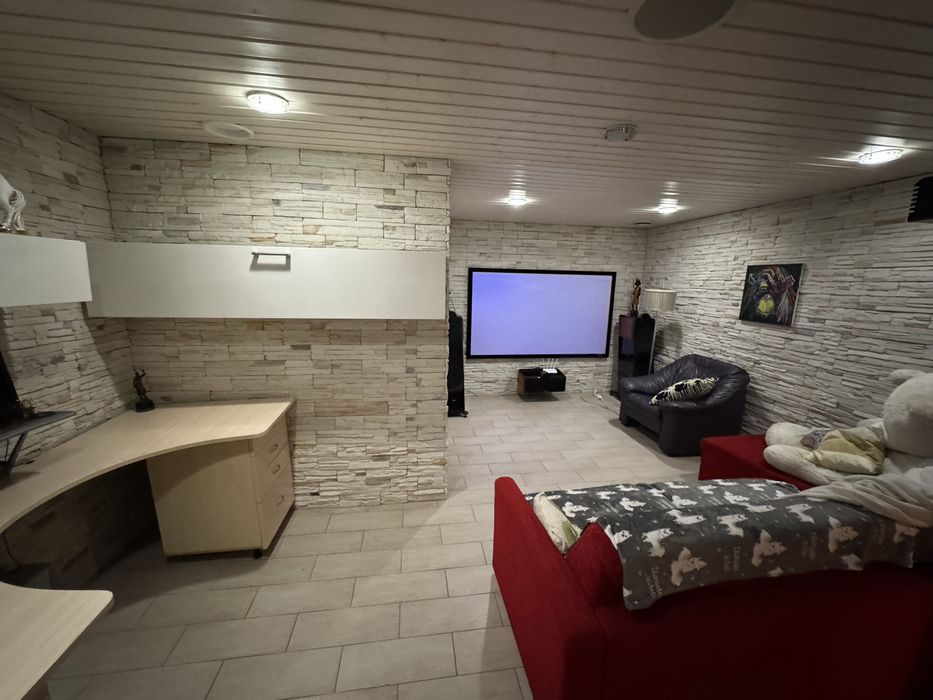 -в будинку є бомбосховище це цокольний поверх з товщиною стін та залізобетонних плит товщиною 55см, на якому розміщена пральна кімната, сантехнічна кімната, сауна, домашній кінотеатр 3кв звуку, та підземний гараж на 2 автомобілів, також тепла підлога.