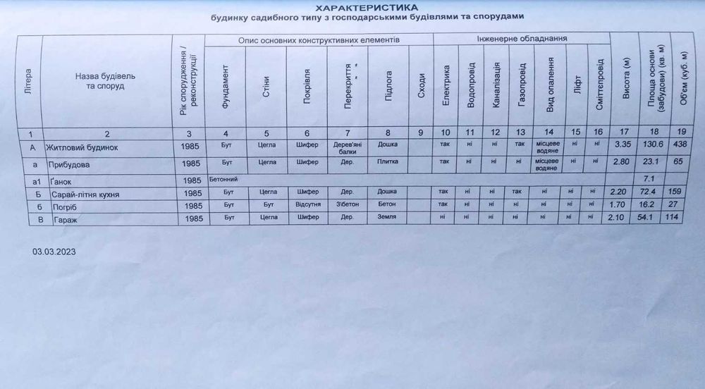На ділянці: житловий будинок, літня кухня з погребом, гараж з підсобними приміщеннями, сарай.