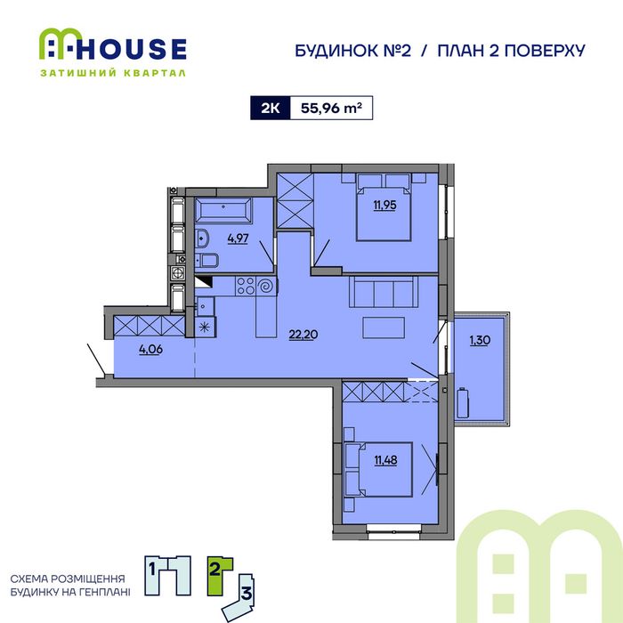- Загальна площа: 56 м²