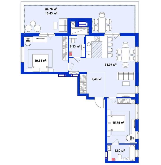 2 виходи на простору терасу (34.76 кв.м.) з кухні-вітальні та спальні. Квартира розташована на 5 з 8 поверхів.