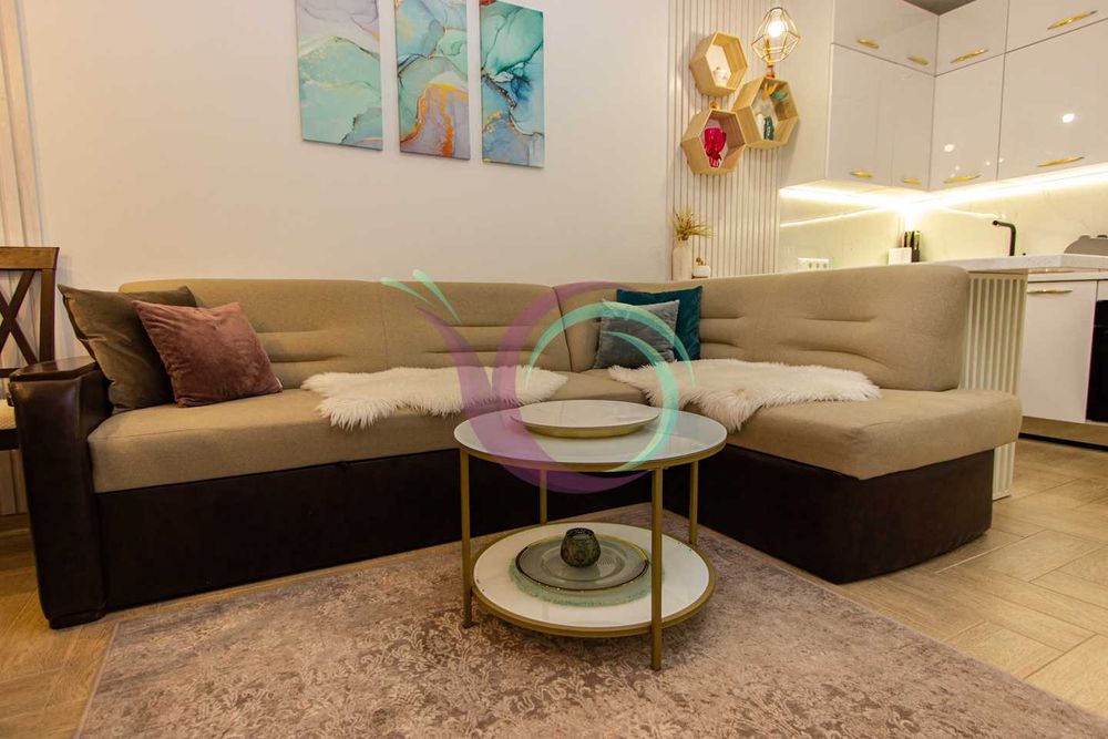 - вітальня з диваном і телевізором, плавно переходить у кухню-студію;