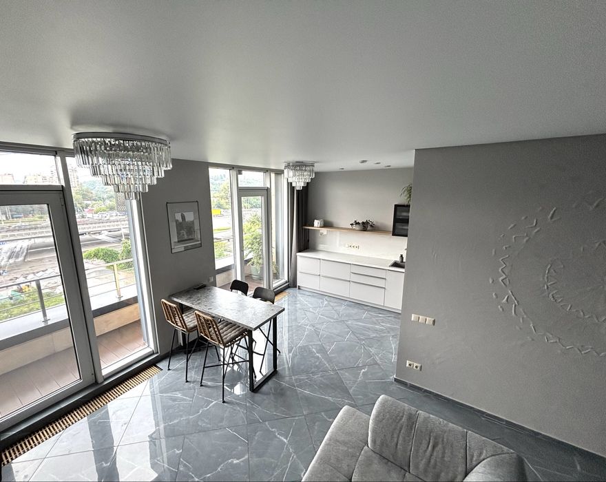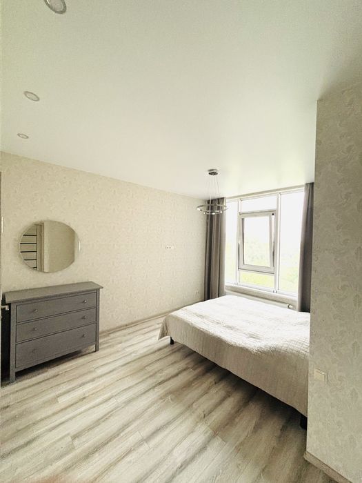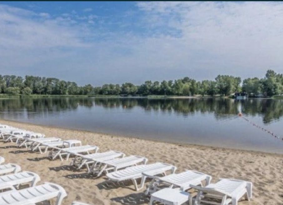 З вікон краєвид на зелену зону та затоку Дніпра.