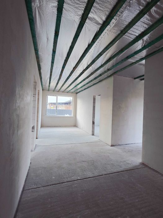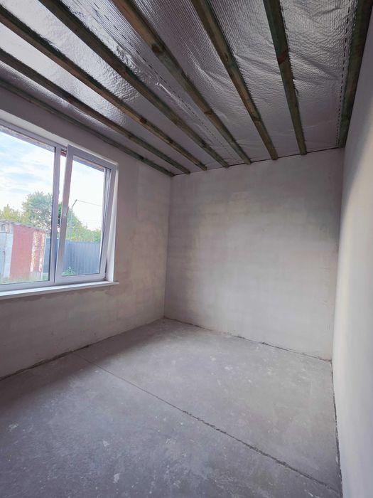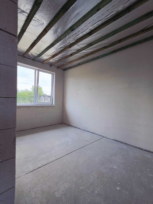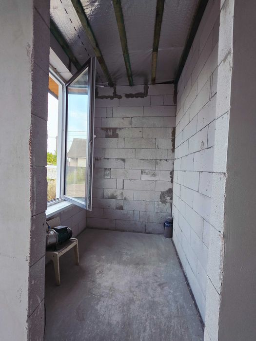 В середині зроблена чорнова стяжка підлоги,штукатурка стін, водовідводи, змонтовані підвіконники, підшита стеля паробар'єром.
