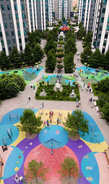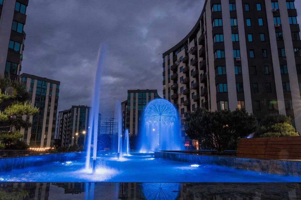 - Зелена доглянута територія з фонтанами для прогулянок.