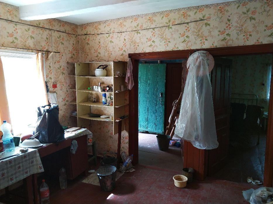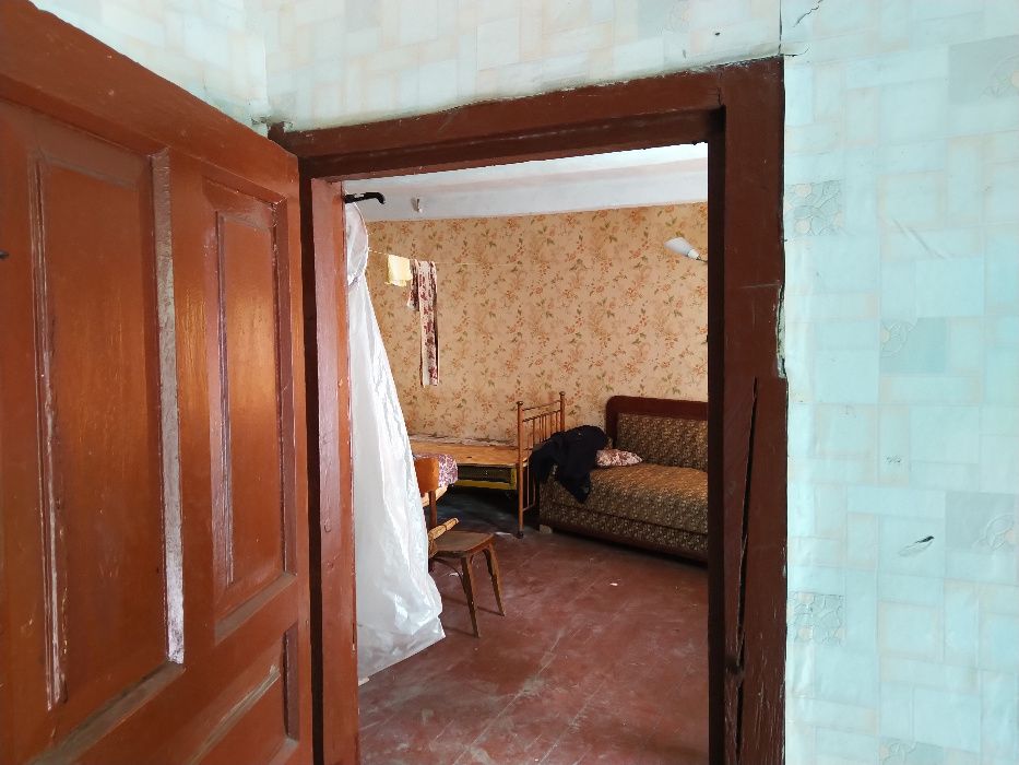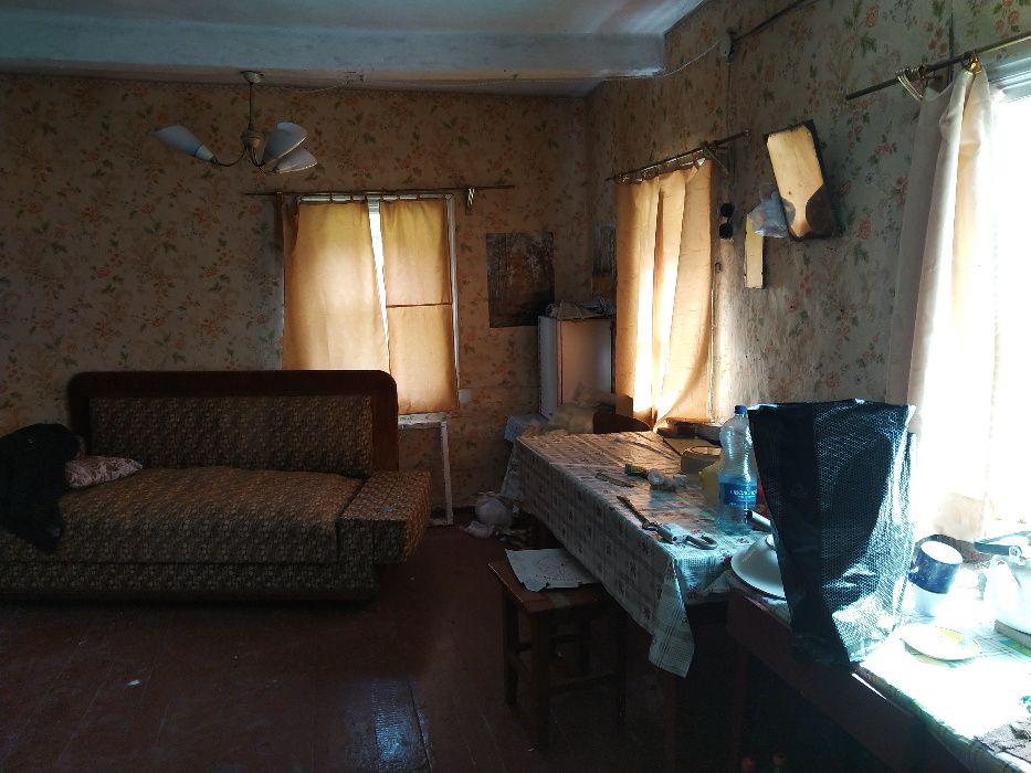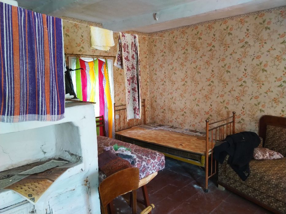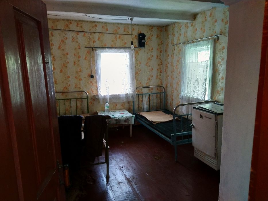 Старый дом, прочная дубовая деревянная основа, пол деревянный в отличном состоянии, есть кровати, диван, стол, стулья, советский небольшой холодильник.