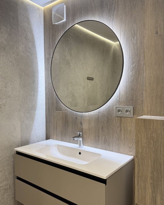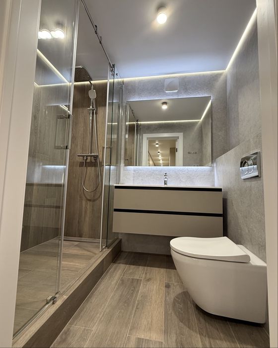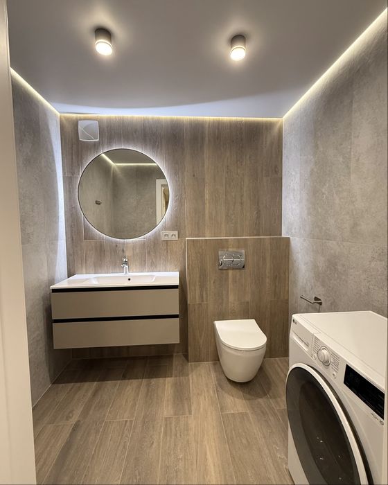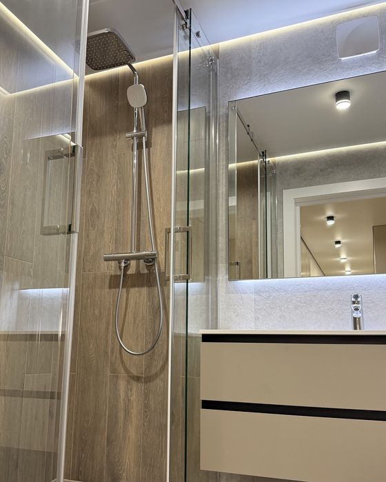 Оздоблення – іспанський широкоформатний керамограніт. Встановлено душову систему Grohe з термостатом, сучасну прально-сушильну машину LG та теплу підлогу.