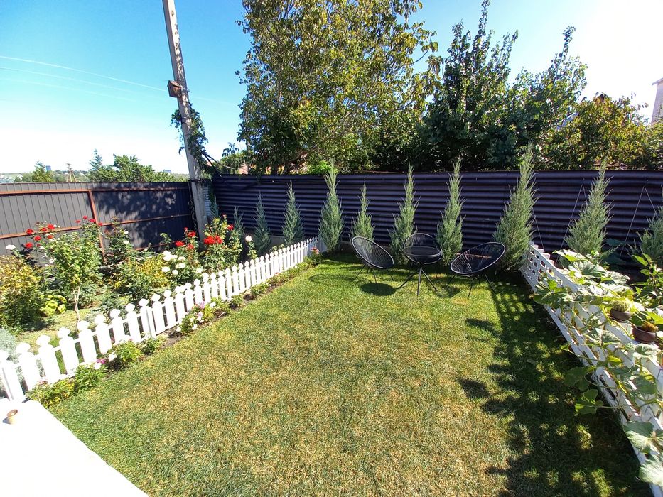 У дворі приблизно 1,5 сотки землі - клумби, зона відпочинку, плодові дерева.