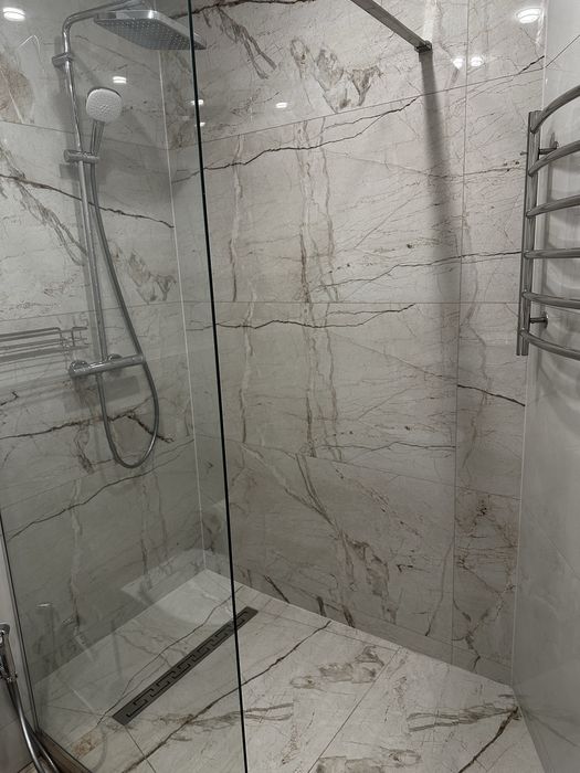 Душова кімната з великою душовою, вбудованим унітазом та гігієнічним душом, пралкою, рушникосушаркою.