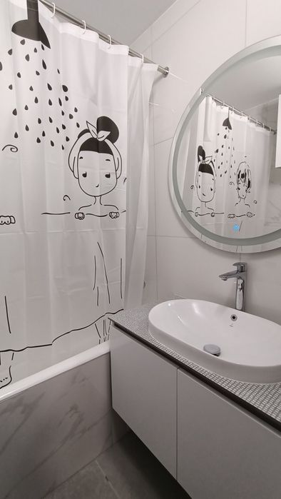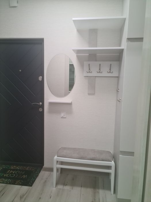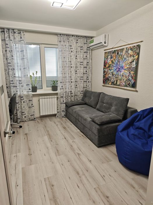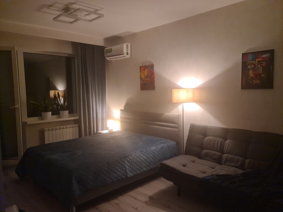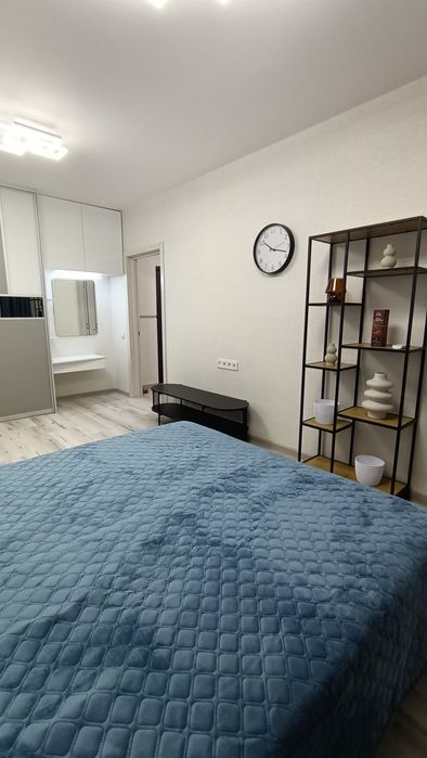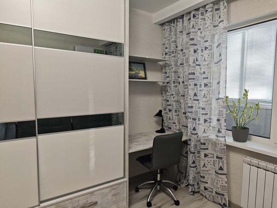Загальна площа: 55.3 кв.м, кухня 9 кв.м., застеклена лоджия 8.3 кв.м. Ванна і туалет - роздільні. В квартирі - дві окремі кімнати. В одній двуспальне ліжко і диван-книжка, велика шафа-купе; в другій - розкладний диван-кровать, велика шафа-купе, робочий стіл з кріслом. Люстри з регулюванням освітлення пультом.