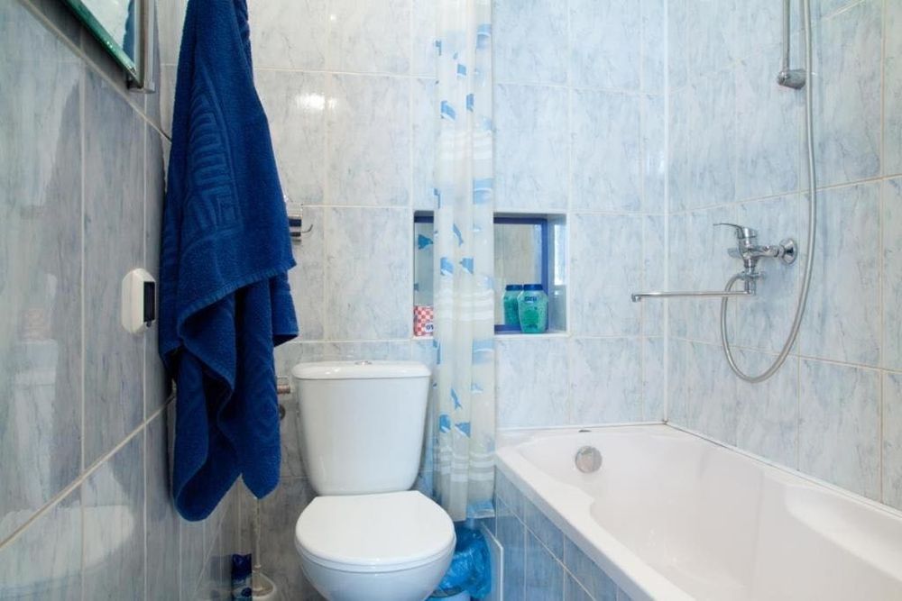 Ванна кімната обладнана всім необхідним: є ванна, туалет, фен і дзеркало.