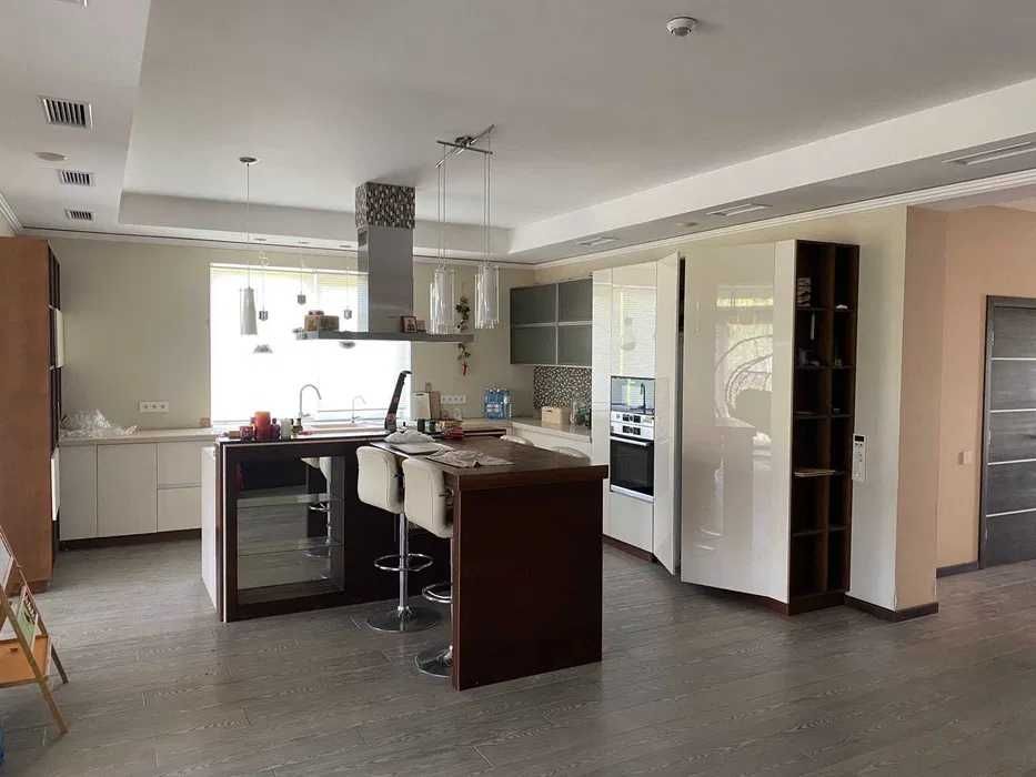 Кухня обладнана всією необхідною побутовою технікою, є острів, великий обідній стіл на терасі; кухня з вмонтованою технікою BOSCH: духовий шаф, холодильник, морозильна камера, мікрохвильова піч, посудомиєчна машина, велика варочна поверхня, 2 витяжки: вмонтована та навісна. Велика південна тераса з видвижними панорамними вікнами (тип гармошка) у внутрішній двір. Санвузол першого поверху: душова кабінка, унітаз, біде, умивальник, пральна та сушильна машини BOSCH. Облаштована гостьова кімната та котлова з окремим виходом на вулицю.