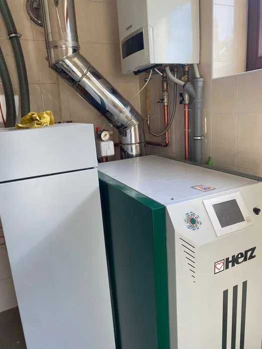 -В котельні встановлений газовий конденсаційний котел BUDERUS, а також резервний пелетний котел HERZ з автоматичною подачою пелет з приєднаного бункера для палет на 5 тон, комбінований бойлер 200 літрів з можливістю роботи від двох котлів (або від газового або від пелетного) або від електрики.