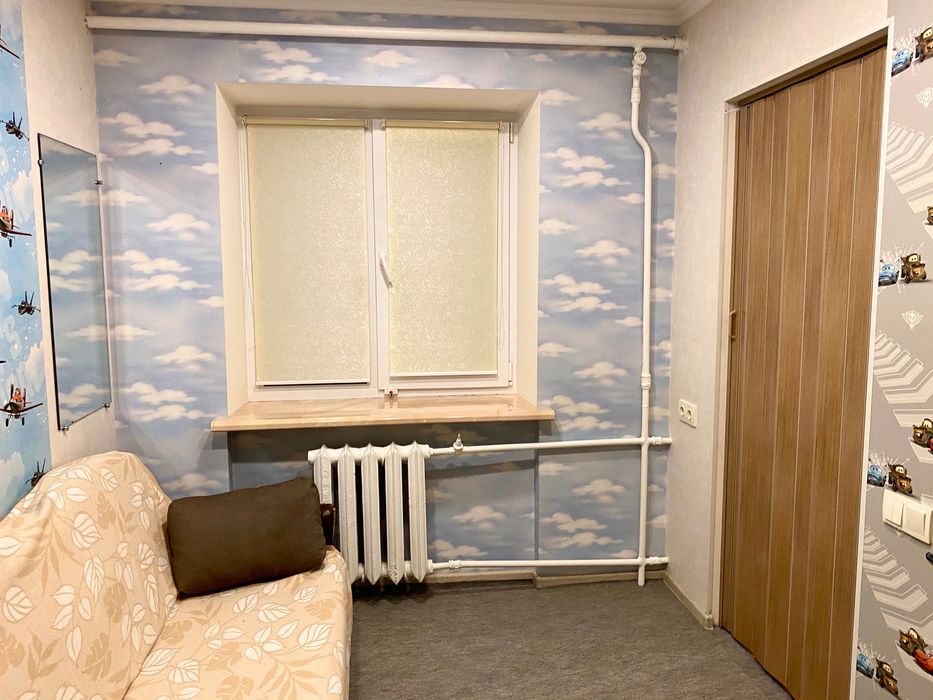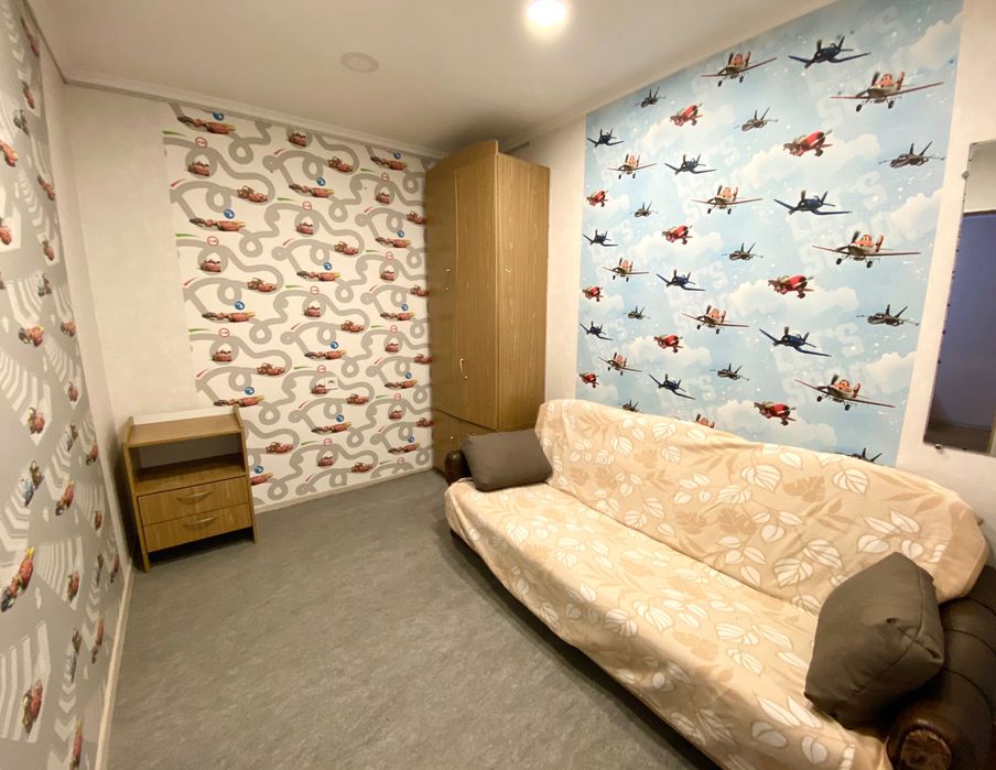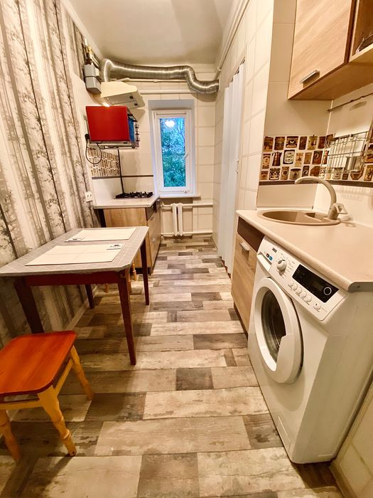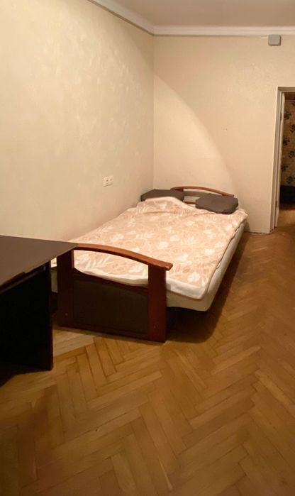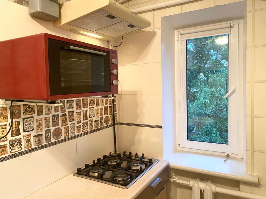 Висока стеля. Плита - газ, для гарячої води - бойлер. Двозонний електролічильник. Всі необхідні меблі та техніка - диван-ліжко з ортопедичним матрасом Венето, 2-гий диван, 3 шафи (однієї нема на фото) + ніша на верхній одяг і взуття в коридорі. Два письмових столи(+1 в малій кімнаті, нема на фото), пральна машина, холодильник, електропічка, витяжка, бойлер. Засклений балкон з видом на територію НАУ та каштани. В коридорі та на кухні також є "антресолі" - багато місця для зберігання під стелею. В великій кімнаті вбудована шафа на всю висоту(на фото немає).