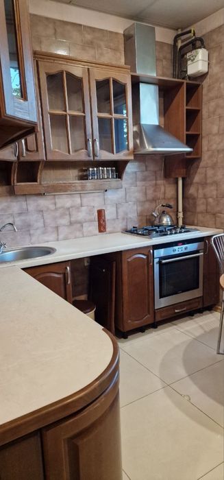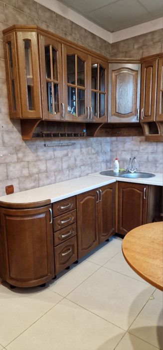 кухня з дерева (але естетично вже хочеться реставрації або заміни), газова поверхня + електродуховка та витяжка;