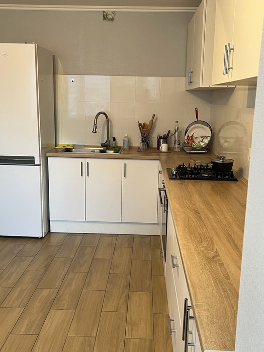 У квартирі індивідуальне газове опалення, газова поверхня, електро духовка, великий холодильник, телевізор та пральна машина на 8кг.
