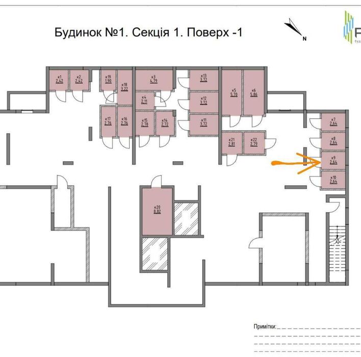 КОМОРА - 2,64 м2, знаходиться в першому будинку (третя черга), перша сеція, на мінус першому поверсі неподалік від входу на поверх.