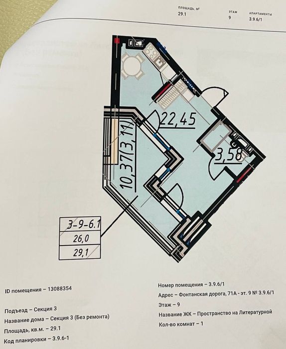 Квартира жилой площадью 29,1 м2 , + 7 м2 (не жилая часть балкона пати-барбекю-зона) расположена на 9 этаже 9 этажного дома, вид на сквер - растительность деревья - фонтанcкую дорогу, перед вами нет соседнего дома в притык с окнами который смотрят на вас, над вами только крыша и небо)) возможность поставить солнечные панели и создать себе автономию(rc), что полезно в наше время и есть практика в Пространстве, квартира идеально подходит для комфортной жизни, отдыха и работы, уединения и наслаждения времени проведенное в ней.