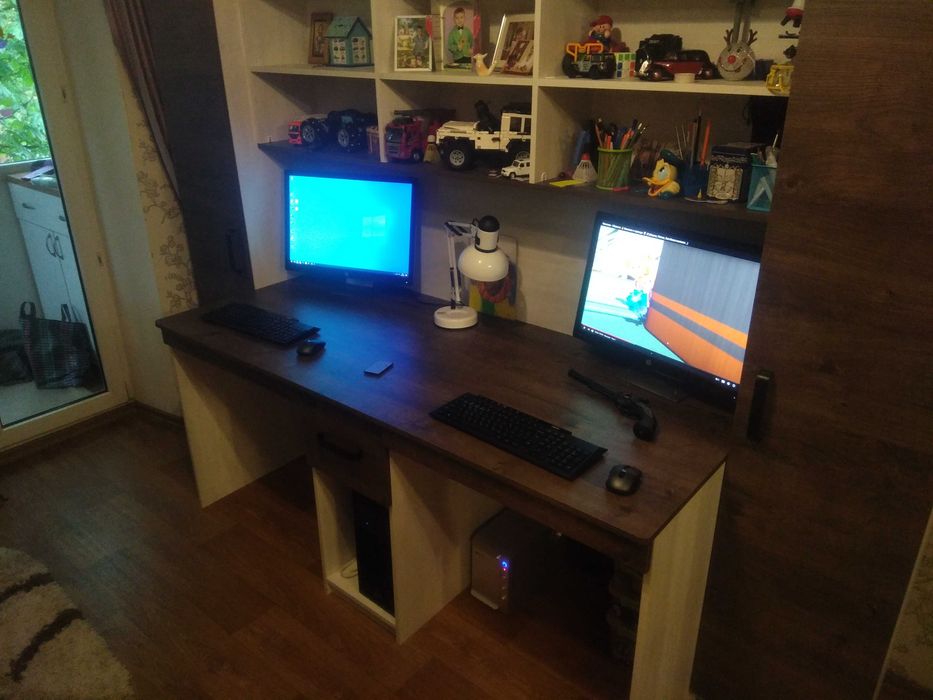Дитяча кімнана: авторське двоярусне ліжко, велика шафа і для школярів великий стіл на два окремих робочих місця з шафами, ортопедичні стільці для дітей.