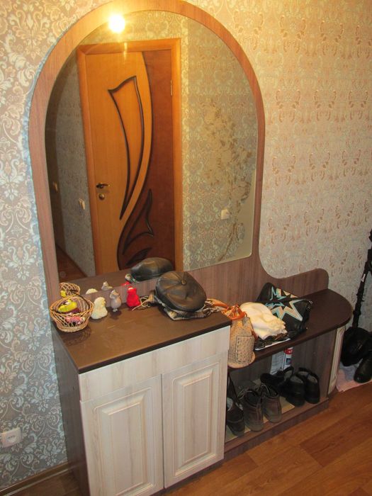 Коридор має дзеркало, тумбу і під шафу зроблена роздягальня з кладовою.