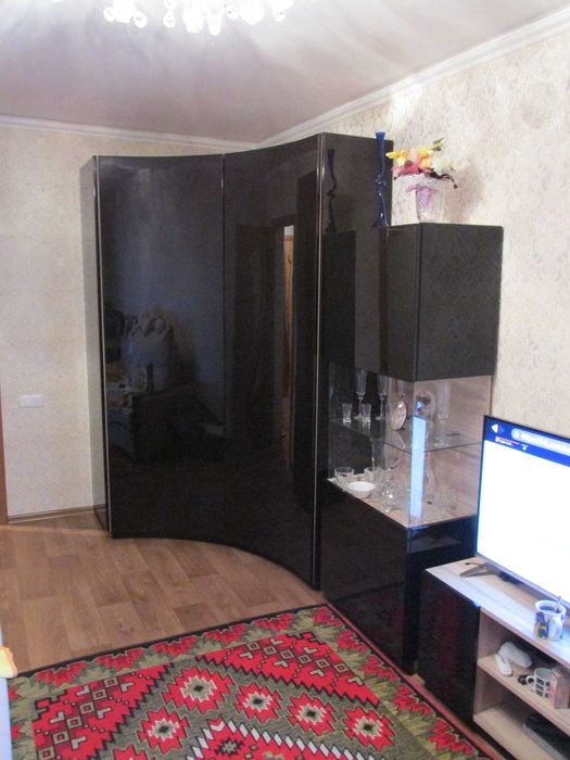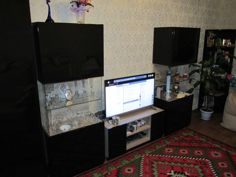 Головна кімната: два великих дивана, велика кутова шафа, серванти і тумба під телевізор, кондиціонер.