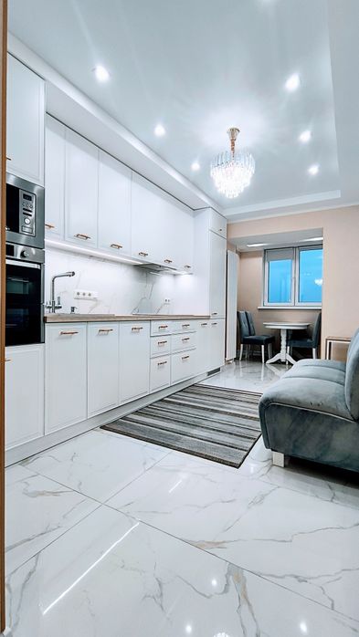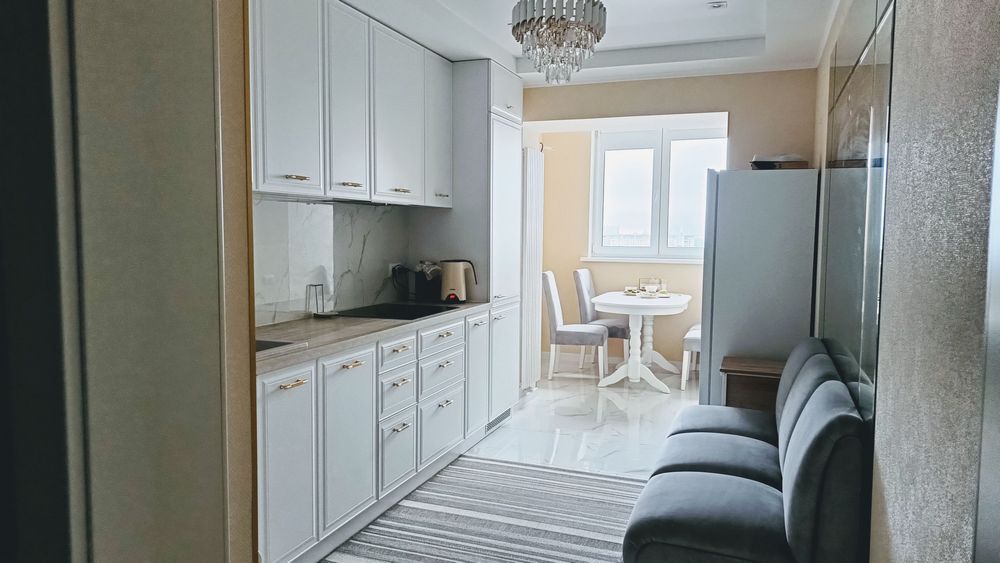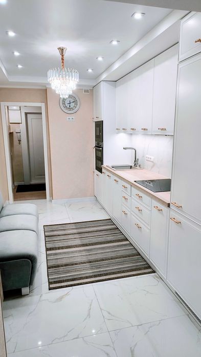 Сучасна кухня з лоджією, 15 м2 повністю укомплектована всим необхідним, вбудований холодильник, електропіч, варочна поверхня, витяжка, мікрохвильова, посудомийна машина, підігрів підлоги. Оснащена систамою фільтрації води.