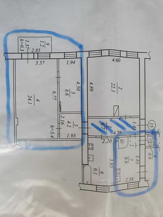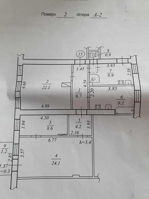 Центральний; Продам 3 -х комнатную в коммунальной квартире или обменяю.; Три комнаты в большой квартире общей площадью 86,8 кв . м ,жилая 54,8 . Квартира официально разделена на 2 отдельные квартиры ,разделены все лицевые счета. Второй этаж ,дом двухэтажный. Продается часть состоящая из 3-х комнат жилой площадью 37 м2,общая 49,5 м2.Комнаты площадью 24,1 8,6 и 4,2 кв. м и собственная отдельная кухня и санузел 9.9 и 0.9 м2 Есть балкон. Общий только коридор. Сосед получил свою часть в наследство и там не живет, есть возможность выкупить всю квартиру Кирпичный дом старой постройки, высота потолка 3,7 м. Дом находится в районе автовокзала. Прямо напротив магазин АТБ .Состояние под ремонт. Продажа от собственника.Обмен на квартиру,дом.