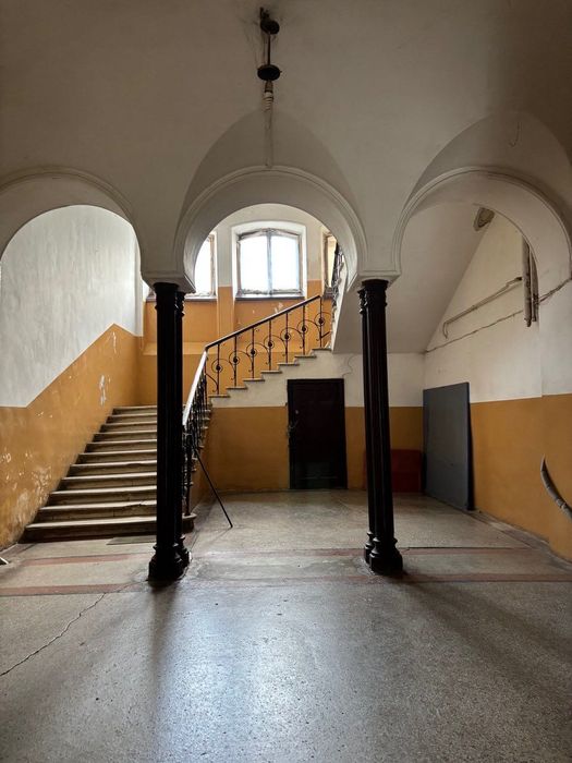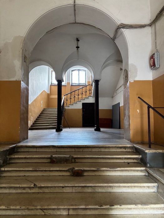 Высокий первый этаж (выше человеческого роста), окна во двор