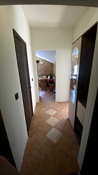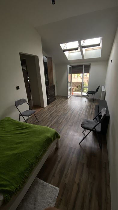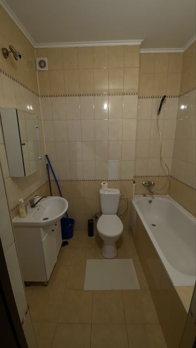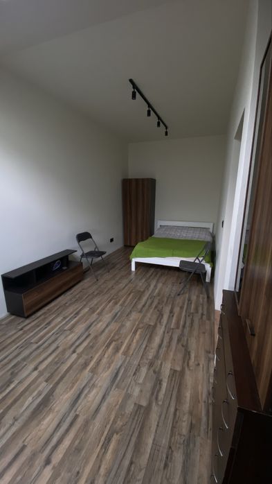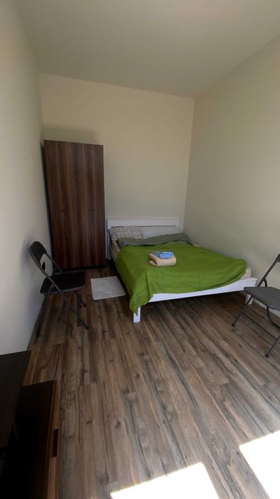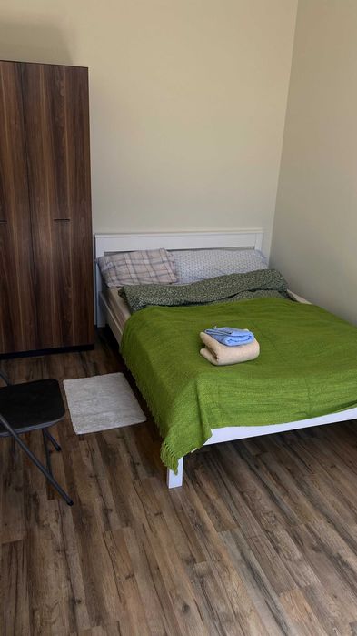 В квартирі є нове півтора/двоспальне ліжко 140 х 200 (см). Також новий матрац, 2-3 комплекти постілі, покривало, подушка. Невелика шафа, комод, тумба. Шафа при вході. Нова пральна машина Samsung на 6 кг (немає на фото).