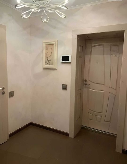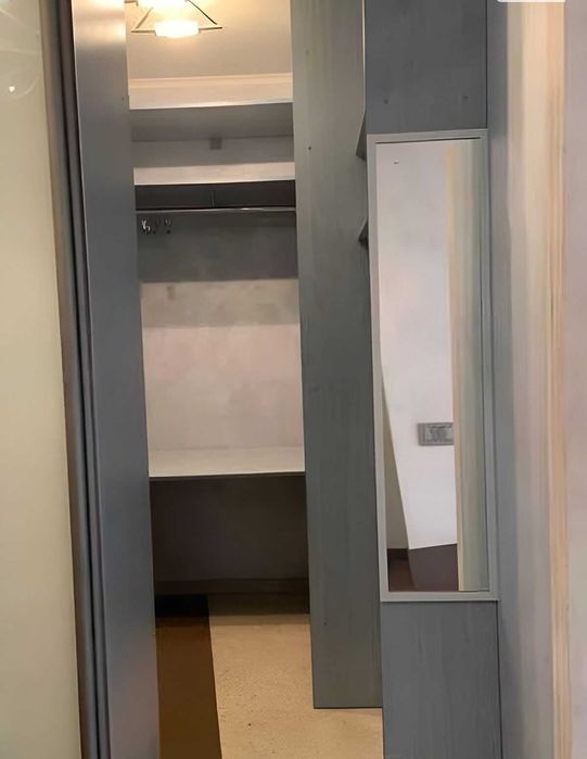Є вся необхідна техніка, гардеробна, двоспальне ліжко та облаштоване робоче місце.
