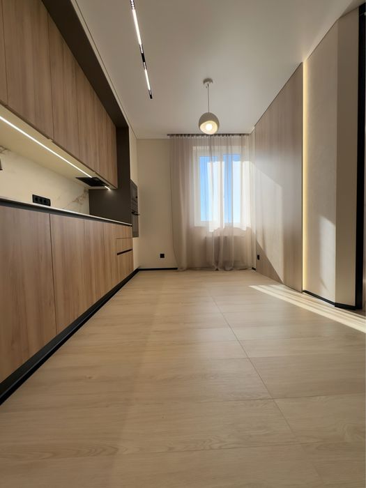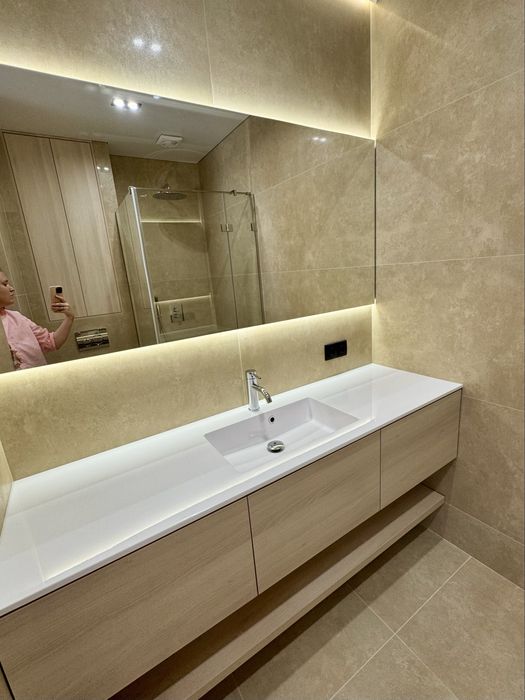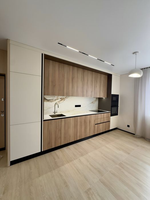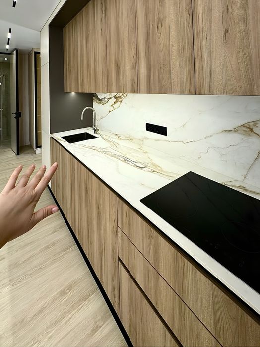 Кухня с дорогих материалов, керамический камень - столешница и с этого же материала рабочая стена, все цельное, не из плитки. Кухня укомплектована качественной техникой Bosh и Siemens. Вместительная, продумана до мелочей. Все встроено: холодильник, посудомойка, вытяжка, варочная панель, духовка и микроволновка.