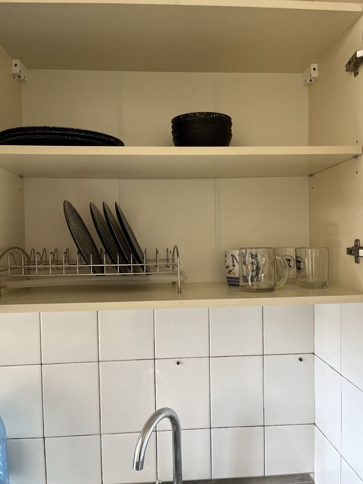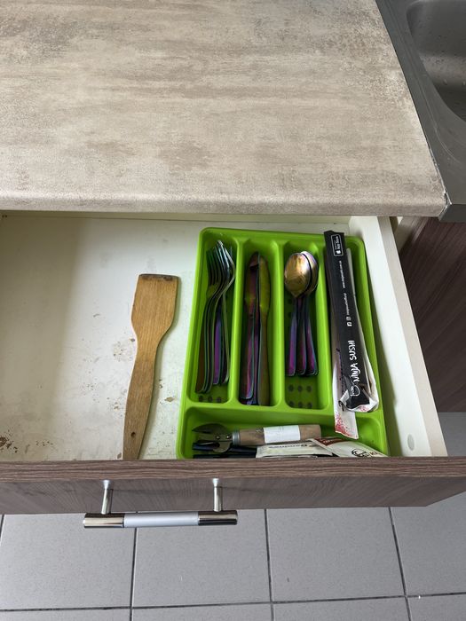 Є набір посуду та кухонних приладів.