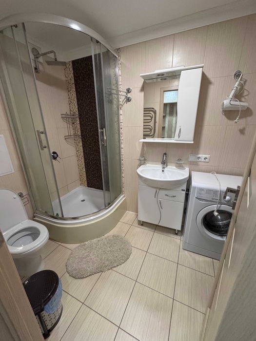 Є охорона сигналізація, домофон, вай-фай, прасувальна дошка, праска, напольна сушилка для білизни,електрична сушилка, духовка, холодильник, кондиціонер, вбудований комод, шафа-купе, пилосос.