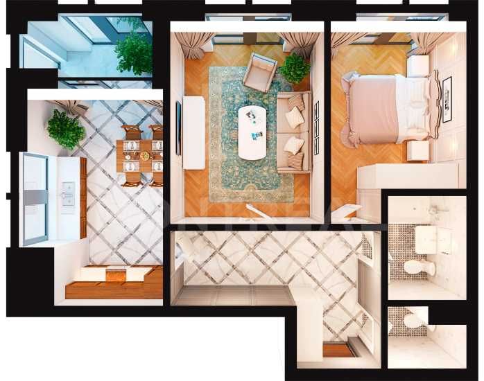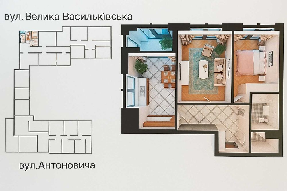 Простора двокімнатна квартира з двома кімнатами, кухнею-вітальнею та двома санвузлами. В будинку є підземний багаторівневий паркінг з можливістю спуститись в нього на ліфті з власного поверху.