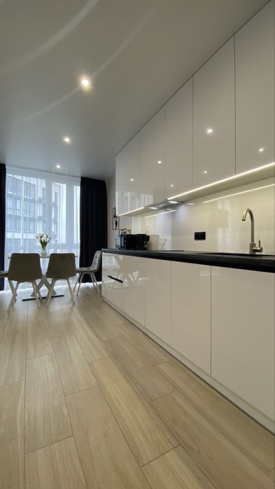 Велика та простора кухня-студія з панорамними вікнами та шикарним видом на місто. Обідній стіл, стільці +