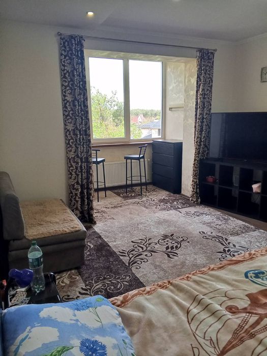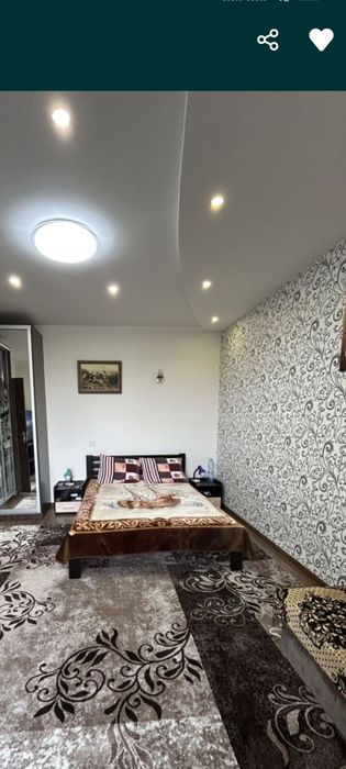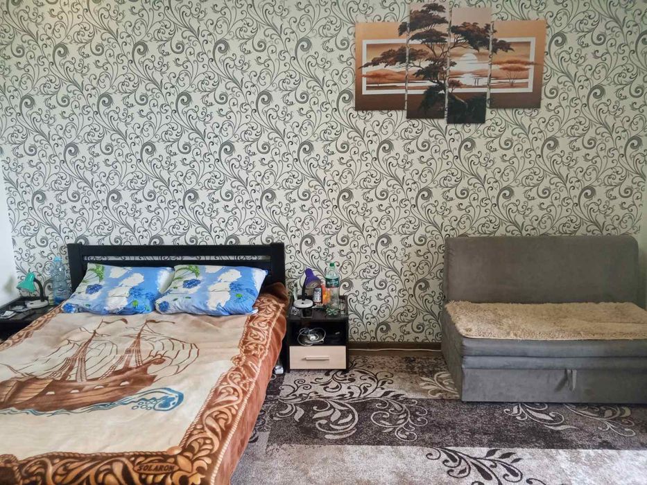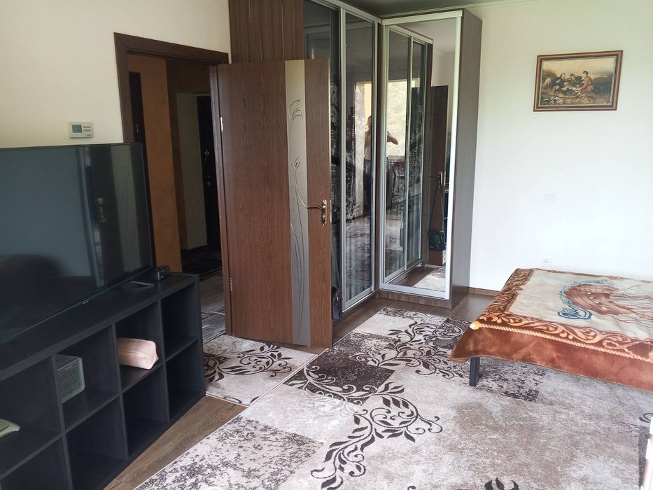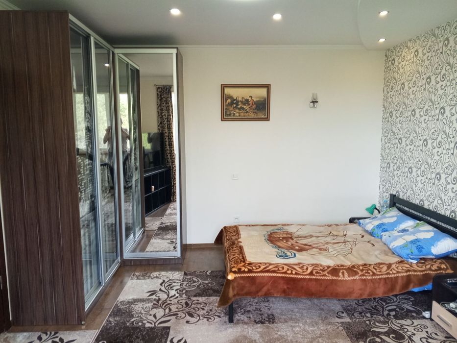 В кімнаті нове двоспальне ліжко ліжко з приліжковими тумбочками.велика шафа купе, розкладний диван,органайзер з великим Смарт ТВ MISTERI.