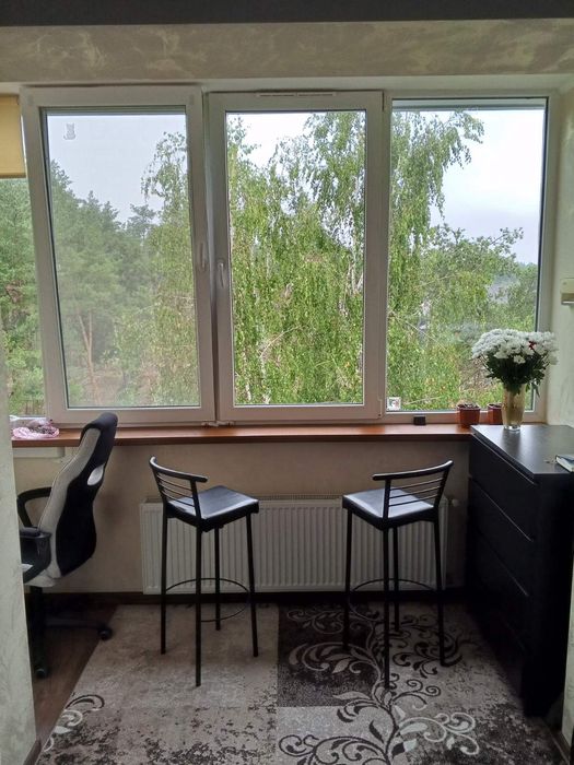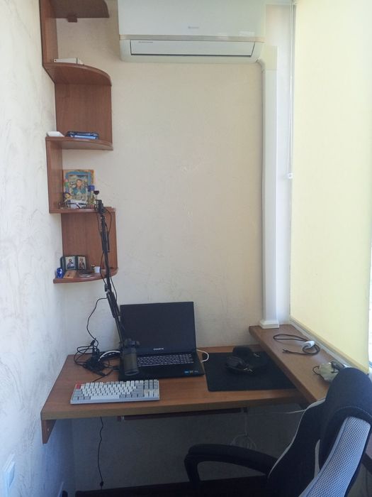 На лоджії робоча зона з комп'ютерним столиком, поличкою для книг, комодом, настінною сушкою для білизни. Також зоною комфорту кондиціонер і два барних стільця біля панорамного вікна.