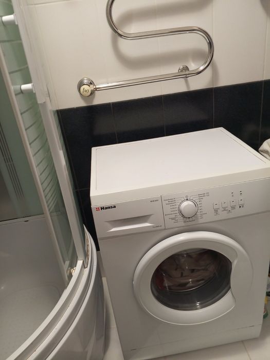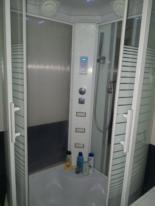 В ванній кімнаті сучасна душова кабіна ,пральна машина, унітаз і умивальник з тумбою а також полички для речей.