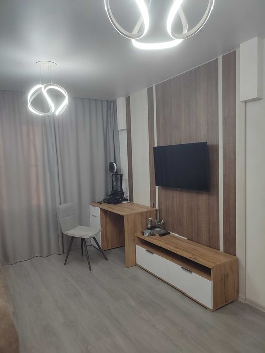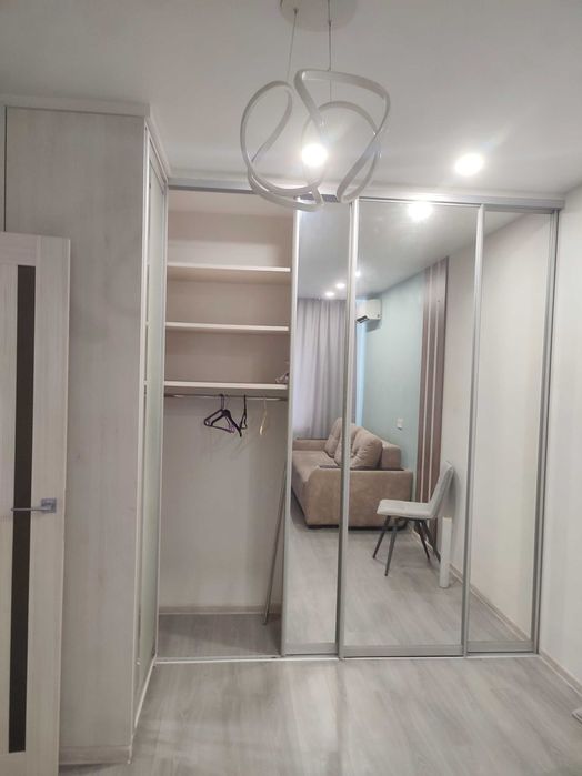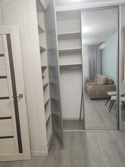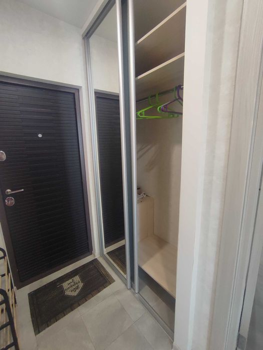 У спальні є велика кутова шафа- купе. Є кондиціонер. Шафа-купе при вході у квартиру. На кухні є розкладний диван, розкладний стіл 90х120 (60х90 у складеному стані), що також регулюється по висоті. Є телевізор. Тобто кухню можна трансформувати і у зону кухні -столової, і у зону вітальні.