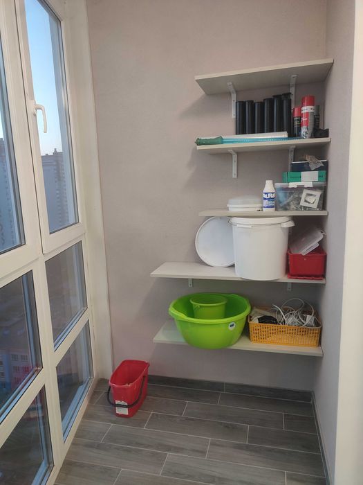 Є великий панорамний балкон з поличками для зберігання речей, вихід з кухні.