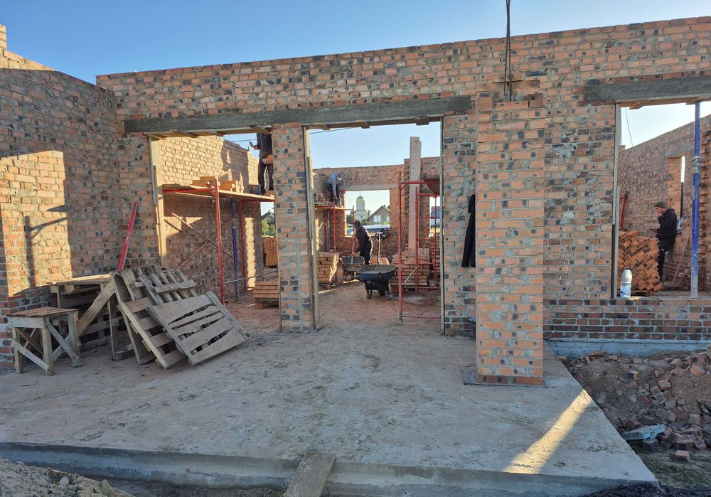 Внутрішні роботи: чистова стяжка, штукатурка, розведено електрику та водяну теплу підлогу по всій площі будинку)