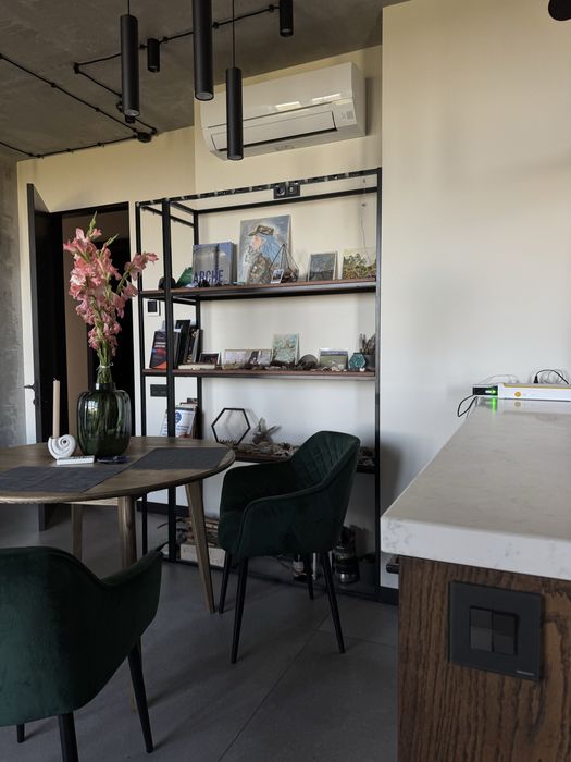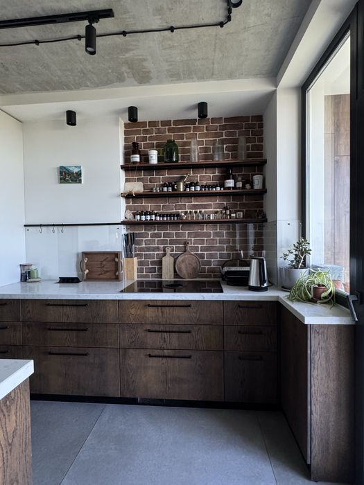 Кухня обʼєднана із вітальнею, у якій розміщено столову та відпочинкову зону.