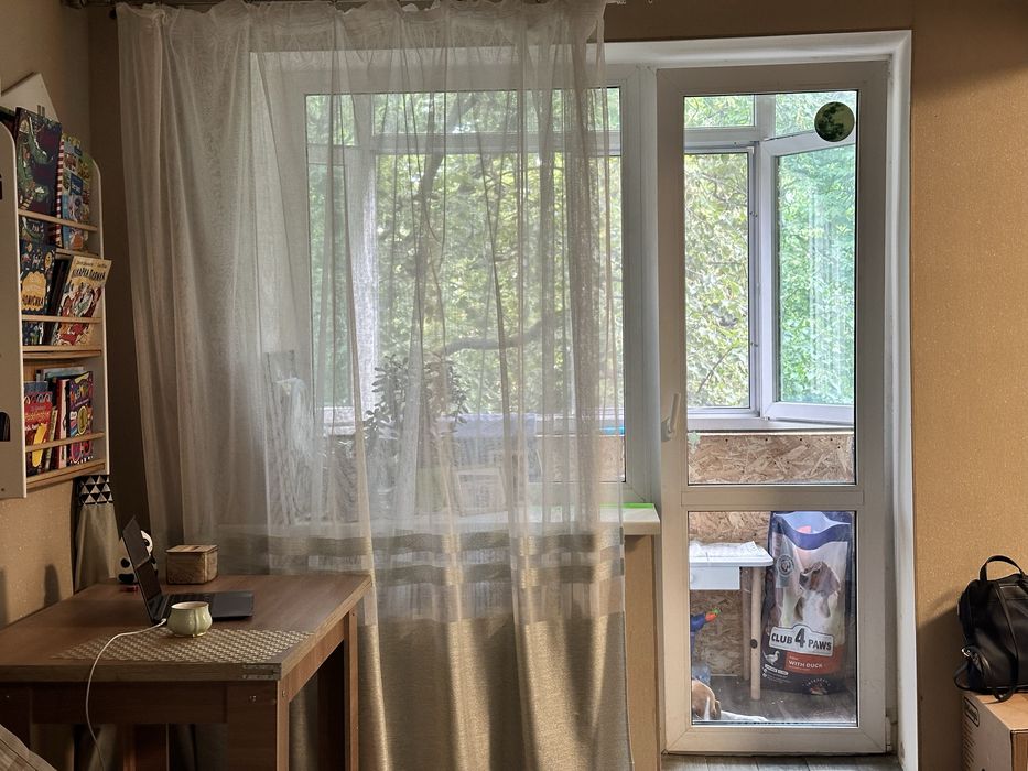 - Затишна кімната з великим вікном, що наповнює простір природним світлом
