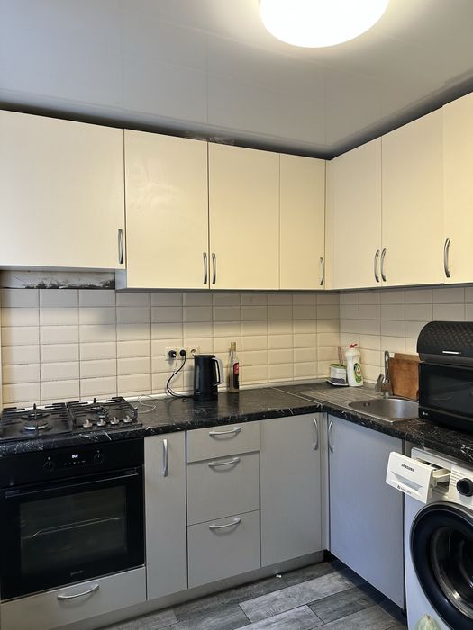 - Простора кухня з сучасним гарнітуром, технікою та плиткою