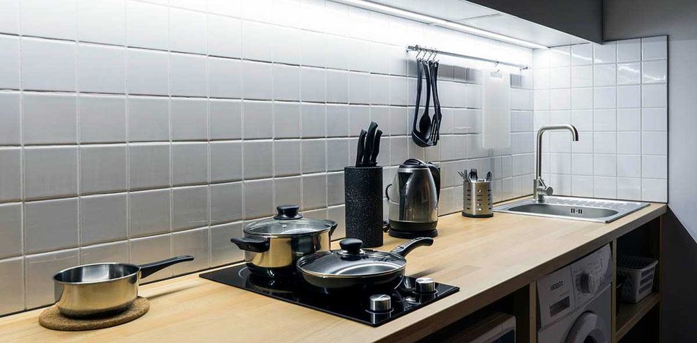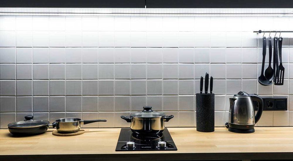 Кухня оборудована холодильником, электрической плитой, чайником, микроволновой печью.