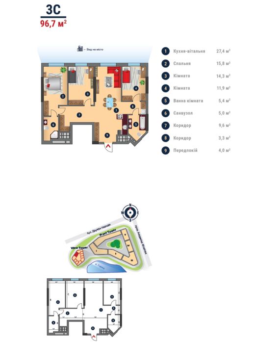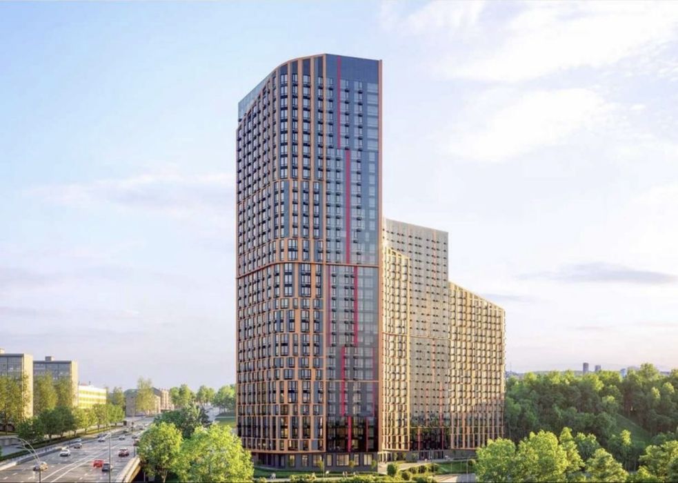 Квартира площею 96.7 кв.м., розташована на 18 поверсі 33 поверхового будинку.